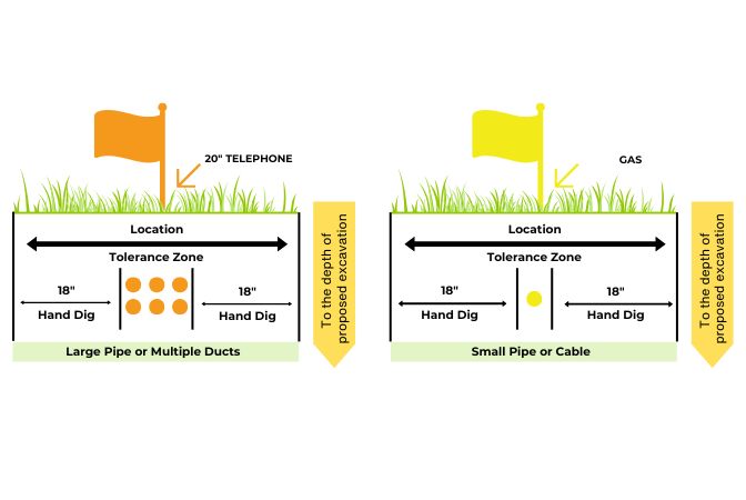 The tolerance zone—a pre-defined horizontal distance extending from the outer edge of underground facility marks, to the depth of your proposed excavation—acts as a warning to proceed with caution while digging in this area.